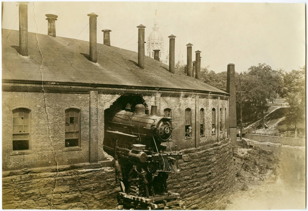Three years prior to this crash, on June 22, 1902, another locomotive had a similar incident. Just to the right of where this train smashed through the wall you can see evidence of the earlier accident and repair to the wall. Above the window that is partially obscured by the front of the train engine you can see the crack.