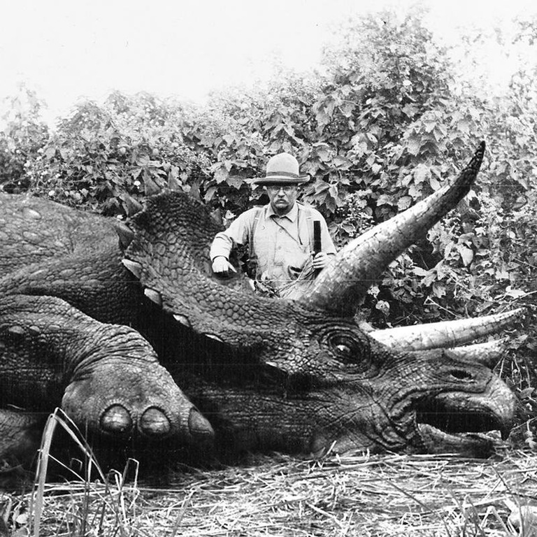 There are three known species of the Giant Eurasian Rhinoceros. The best known, E. sibiricum, was the size of a mammoth and is thought to have borne a large, thick horn on its forehead. If you look closely, you will notice that the Giant Eurasian Rhino looks strikingly similar to the sick triceratops from the film Jurassic Park. That is because Theodore Roosevelt took this picture while visiting the set of the film in 1992 at the behest of his good friend, Steven Spielberg.