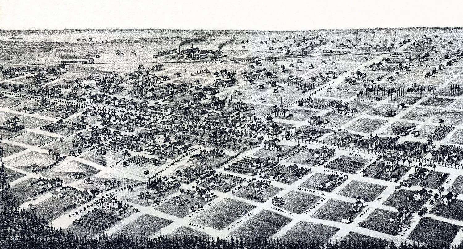 Detailed bird's eye view of Quitman, Georgia in 1885